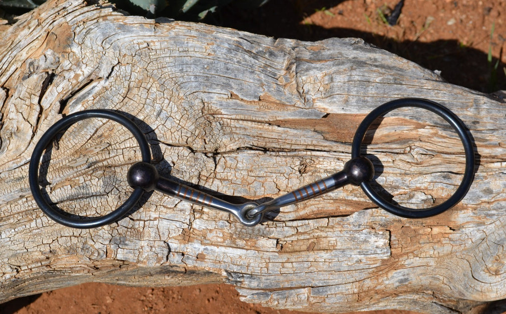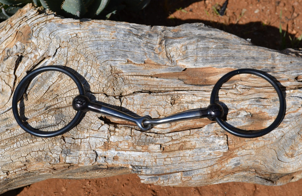 JWP- Blued Ring Snaffle– this snaffle has a 5.25” wide sweet iron mouth, 3/8 diameter with heavy copper inlays. Trainers, ranchers, buckaroos and vaqueros all praise this snaffle pattern for its quick response and the great feel it offers to the colt they are training. Handmade with attention to function and detail, there are no sharp edges and corners, the joints all move with precision.  These bits come standard in the 5 1/4" mouth and are suitable for average size horses.