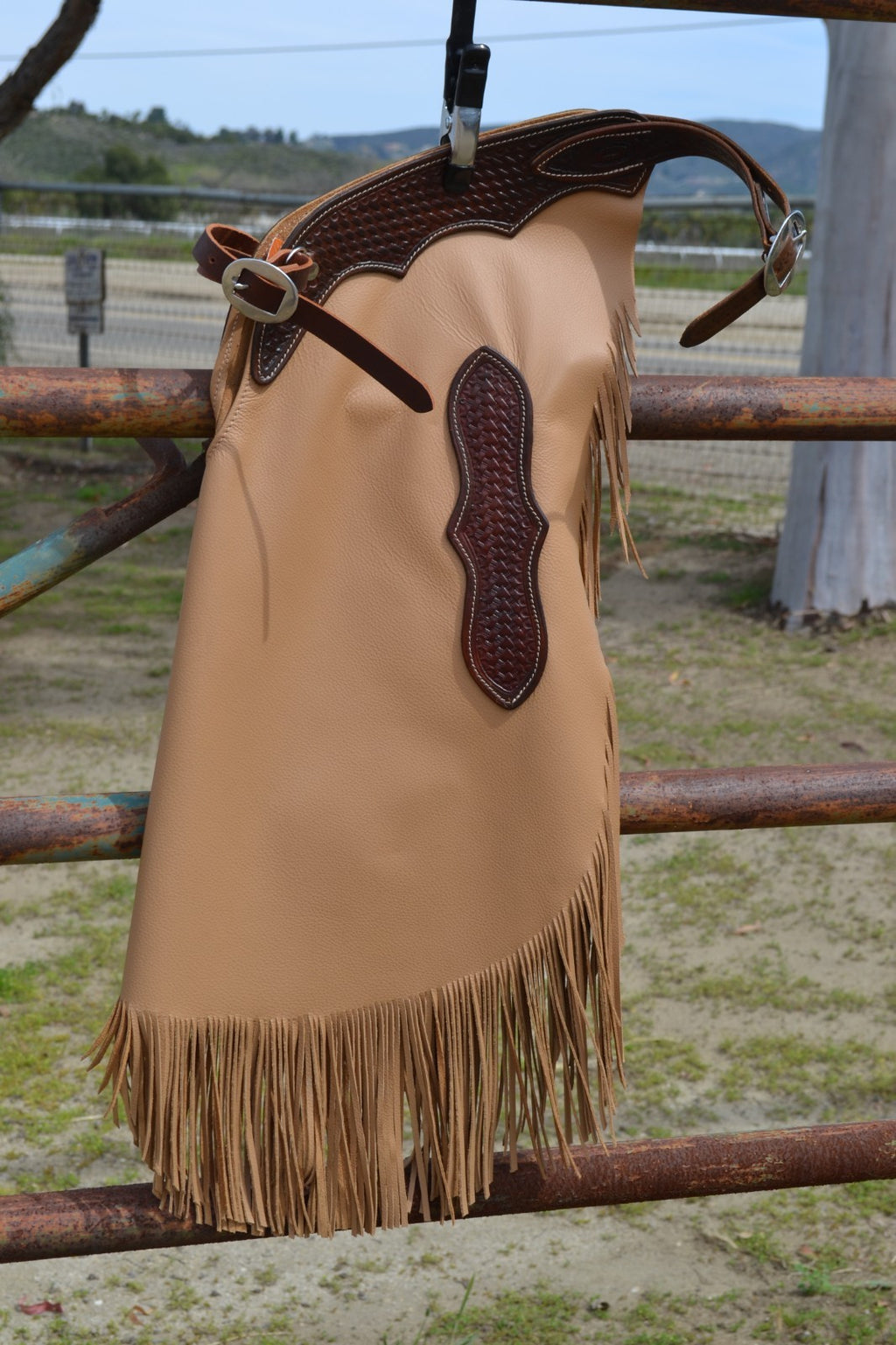 Top Grain Chinks made from tan super soft chap leather.    Long fringe cut from the same leather as the chinks, provides a less bulky cleaner look.  Sized and Adult Standard, which is typical of a Medium/Large size.   Hand Tooled chocolate leather yoke and rear adjustment.  Front adjustment is made from dark burgundy latigo leather.