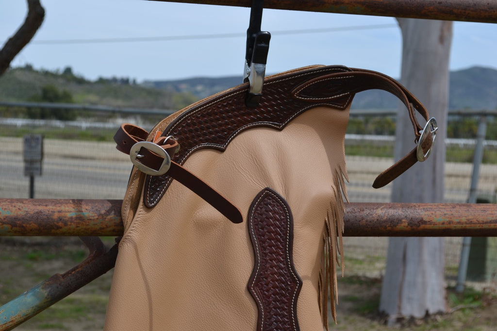 Tan Top Grain Leather Chinks / Chaps with Basket Tooled Yoke Average Size